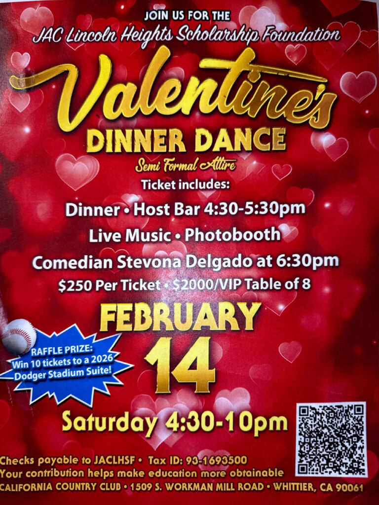 As we begin the new year, the JAC Lincoln Heights Scholarship Foundation is proud to invite our community to a milestone moment, our Inaugural Valentine’s Dinner Dance, taking place on Saturday, February 14, from 4:30 to 10:00 PM at the California Country Club in Whittier Valentines Dinner. This inaugural event marks the start of a new tradition for our foundation, one rooted in love, community, and opportunity. The evening will feature a semi formal dinner, hosted bar from 4:30 to 5:30 PM, live music, a photobooth, and a special performance by comedian Stevona Delgado. Guests will also have the chance to participate in a raffle to win 10 tickets to a 2026 Dodgers Stadium Suite, making the night both meaningful and memorable Valentines Dinner. Tickets are $250 per person, with VIP tables available for $2,000, and all proceeds directly support scholarships that help make higher education more attainable for our students. This event represents more than an evening out, it reflects our collective commitment to investing in the future of our community.